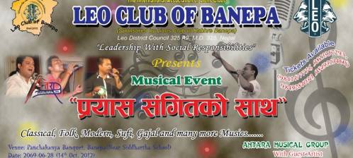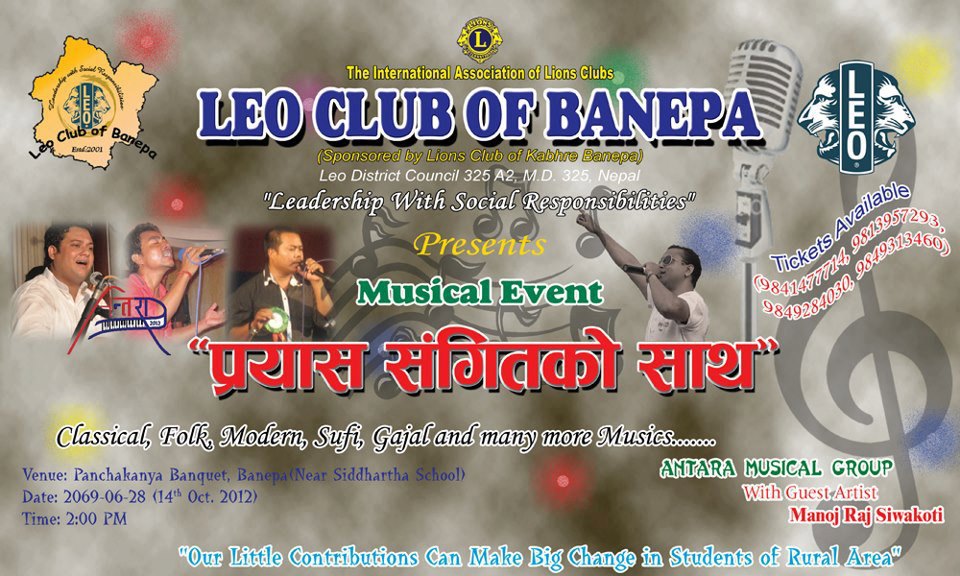 Leo Club of Banepa is one of those 6226 Leo Clubs in International arena which has adopted the same fundamental principle of community service and personality development of individual members. Leo Club of Banepa is also providing various projects in different fields integrating the young people having dynamism and tough character for improving the community and the nation. We have been creating a positive influence on today’s youth and young adults helping them become better citizens and leaders for life. Through out the service we have planned to conduct various Educational projects this year, especially focused on rural areas. As per the objective we are going to organize “Prayaas Sangitko Saath”, musical show such that we can generate support to accomplish our objectives.