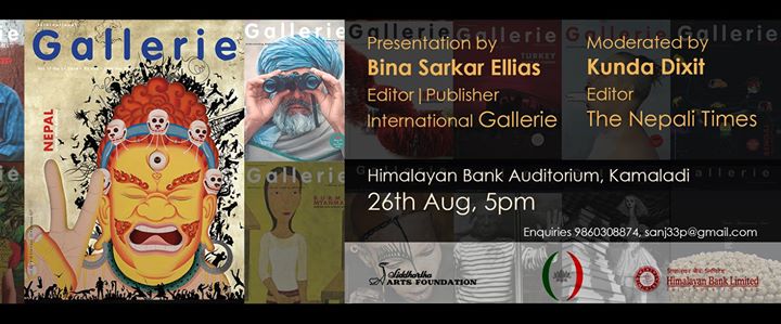 Siddhartha Arts Foundation with support from B. P. Koirala Foundation and Himalayan Bank Limited is organizingPresentation by Bina Sarkar Ellias Editor/Publisher, International Gallerie Moderated by Kunda Dixit Editor, The Nepali Times Venue: Himalayan Bank Auditorium, Kamaladi Date: 26th August..