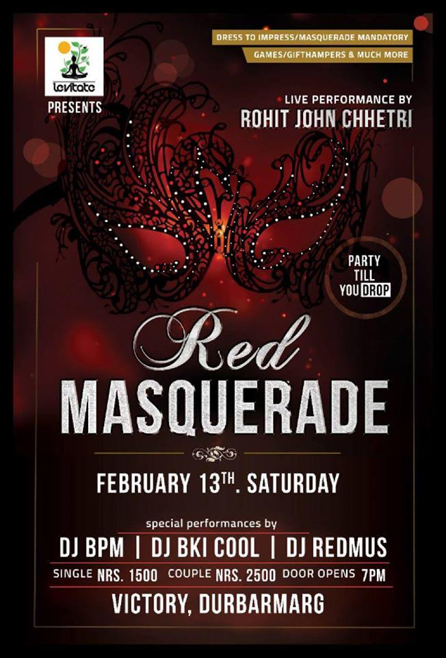 Red Masquerade @Victory Lounge, DurbarmargFEB 13th, SATURDAY7PM ONWARDS*DRESS TO IMPRESS**FREE MASKS AT THE DOOR (with tickets)**20 LADIES GETS IN FOR FREE (FIRST COME BASIS)**10 COUPLES GETS IN FOR FREE (FIRST COME BASIS)***SINGLES, GET READY TO MINGLE****COUPLES, HOW ABOUT A TRIP T..