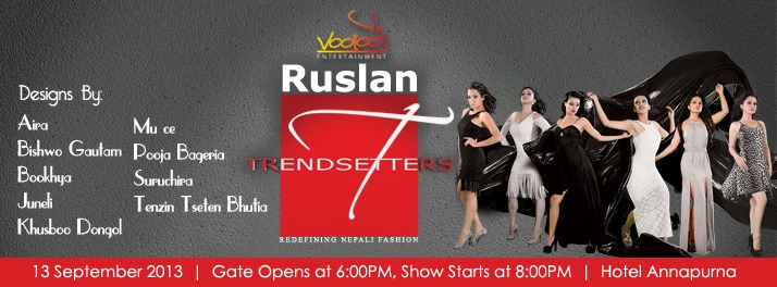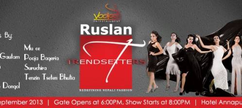Ruslan Trendsetters 2013/14 Nepal Tour covering 16 cities Starting with Kathmandu Showcasing designs by: Aira Bishwo Gautam Bookhya Juneli Pooja Bageria Suruchira Khusboo Dangol Mu Ce Tenzin Tseten Bhutia Choreographer: Rachana Sharma Gurung Music by: Dj Suraj..