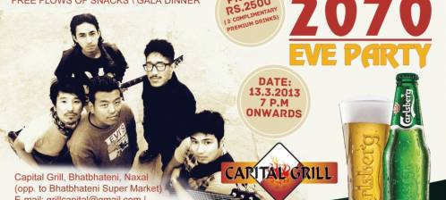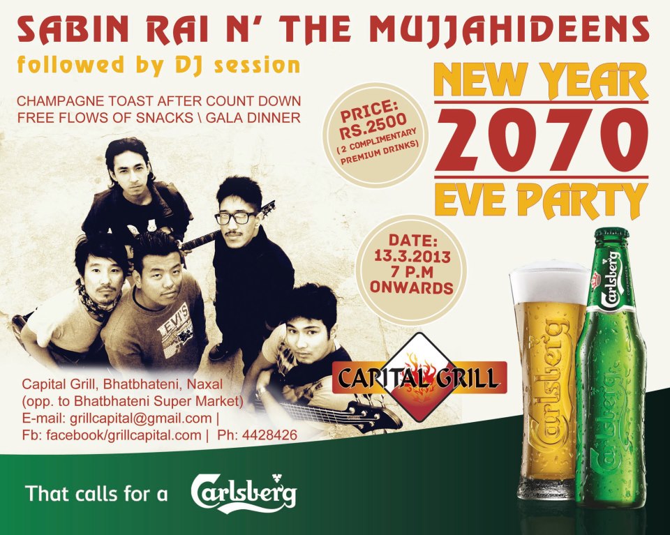 Capital Grill proudly presents "SABIN RAI & The Mujjahideens" on this New Year's Eve 2070.... Ticket Rs. 2,500/- inclusive of free flow of cocktail snacks with *2 complimentary drinks followed by gala dinner..... Champagne toast after the count down!!! DJ NIROZ tak..