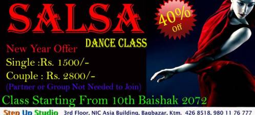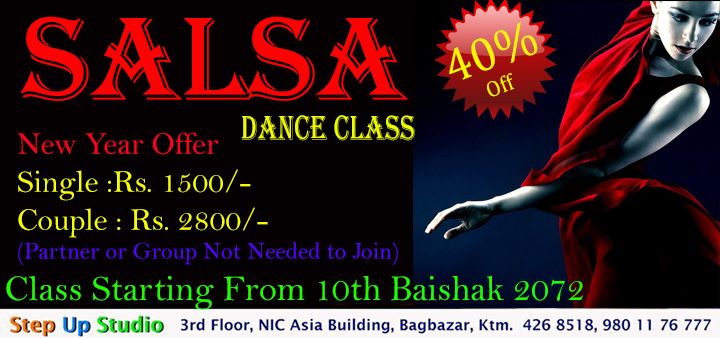 New Year Offer 40% Off on Salsa Classes * Valid Till 10 Baishak, 2072 No Partner or group ?? no Problem anyone can join, no partner is needed For all who want to Learn Salsa, in just 7 days. you will be learning L.A. Salsa on 1 for Beginner Level 1 & Level 1 impr..