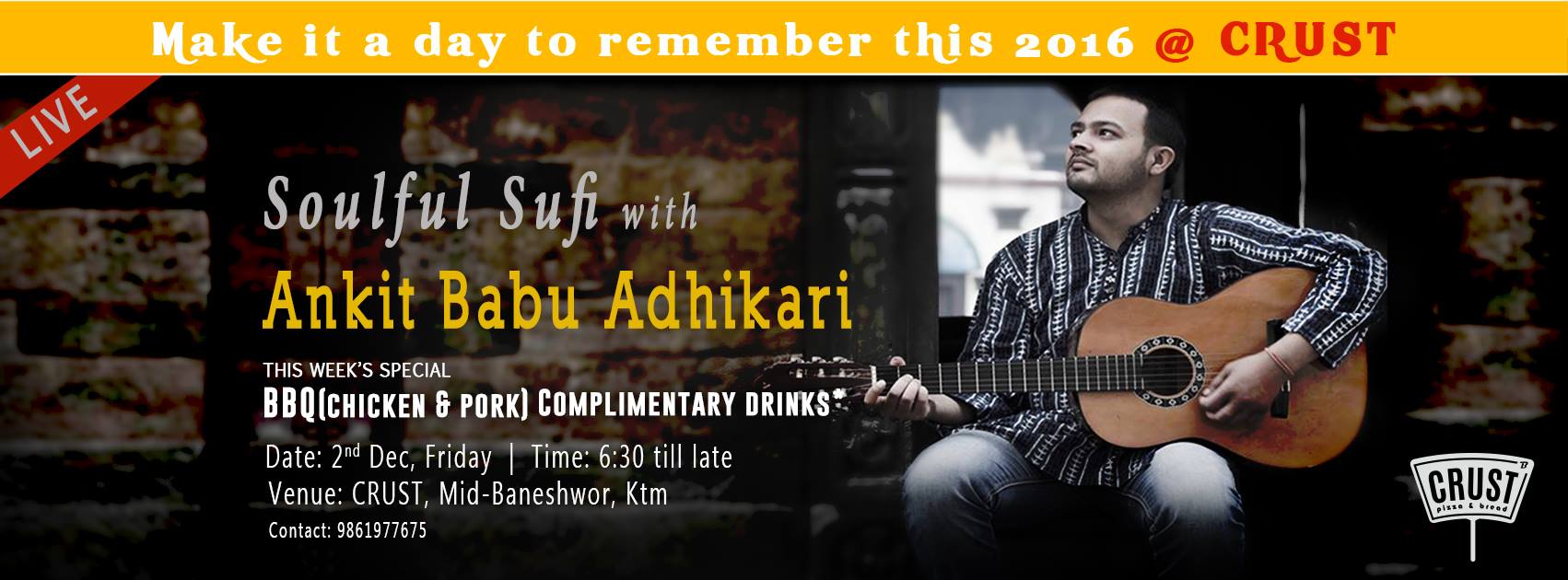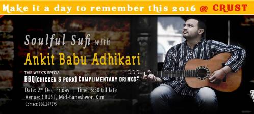 Date: 2nd Dec, Friday | Time: 6:30 till lateVenue: CRUST, Mid-Baneshwor, Ktm Contact: 9861977675..