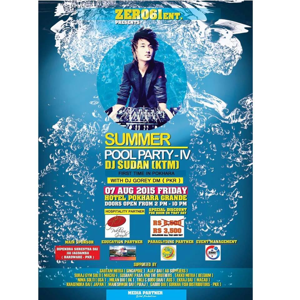 Venue : Hotel Pokhara Grande, Pokhara Time : 2 pm to 10 pmTicket Price : Rs. 1000( with any drinks ){ P.S. we have a special discount on rooms Rs. 3500 instead of Rs. 6500}..