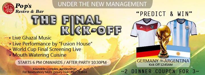 Pop's Restro & Bar (Under New Management) Presents "THE FINAL KICK-OFF" The World Cup 201 Final's "Germany VS Argentina" For the Eve We have: >Live Ghazal Music >Live Performance by "Fusion House" >Live Projection of the Game >Mouth Watering Cuisine For more Information and Reserv..