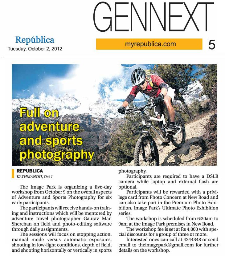 FOR THE FIRST TIME IN NEPALThe Image Park, welcomes you to this innovative indepth 5 day workshop on the overall aspects of Adventure and Sports Photography. Participants will receive hands-on training and instruction both on field and photo-editing soft..