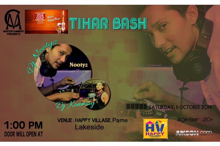 Cash Money Entertainment proudly presents "TIHAR BASH" OUT DOOR PARTY On the occasion of tihar (2071), we will make sure that everyone will be the witness of the beginning of a new outdoor side of party on field. Event Details Date: - 11th oct.(SATURDAY) 2014 Location: - HAPPY VILLAGE,PAME,LAKESID..