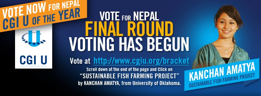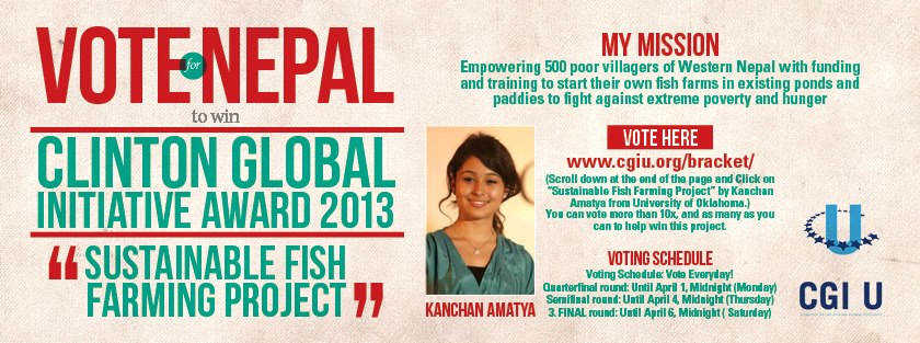 A Nepali Student's initiative has been invited by US President Bill Clinton to compete in the Clinton Initiative Award 2013 for her "Sustainable Fish Farming Project" as her effort to fight extreme poverty and hunger in rural western Nepal. Here's how: