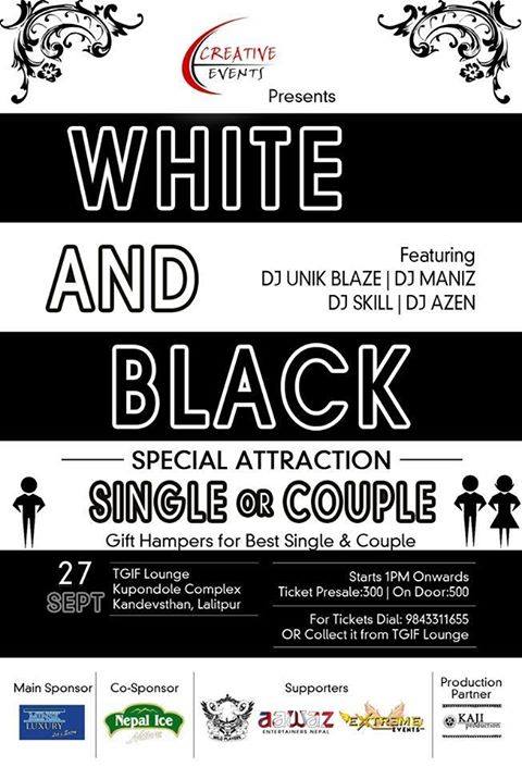 CREATIVE EVENT PRESENTS WHITE AND BLACK. TIME;1 PM ONWARDS VENUE:TGIF LOUNGE PRICE:300,SINGLE AND 500 COUPLE..