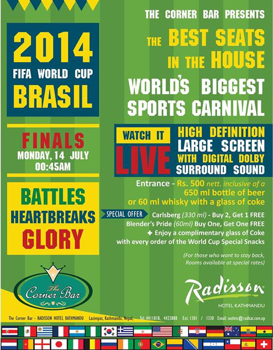 Watch Argentina vs. Germany play in one of the world's biggest sports carnivals LIVE ! at The Corner Bar, Radisson Hotel Kathmandu. High Definition Large Screen with Digital Dolby Surround Sound. Entrance Rs. 500 nett with lots of exclusive snacks, drinks and other offers. For more info. contact 4411818 Ext. 1330 /1301